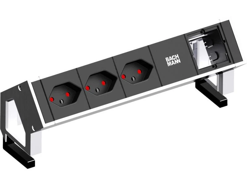 Die Steckdoseneinheit DESK 2 beinhaltet 3 Buchsen vom Typ T13. Zudem verfügt die Leiste über ein Leerfeld, welches mit einem Custom Module von Bachmann erweitert werden kann (VGA, RJ-45, etc).
